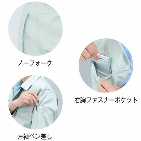 | 樹脂ドットボタン、左胸ポケット(巾18cm×深さ17cm)、右胸ファスナーポケット(巾13cm×深さ16cm)、ノーフォーク、左袖ペン差し |