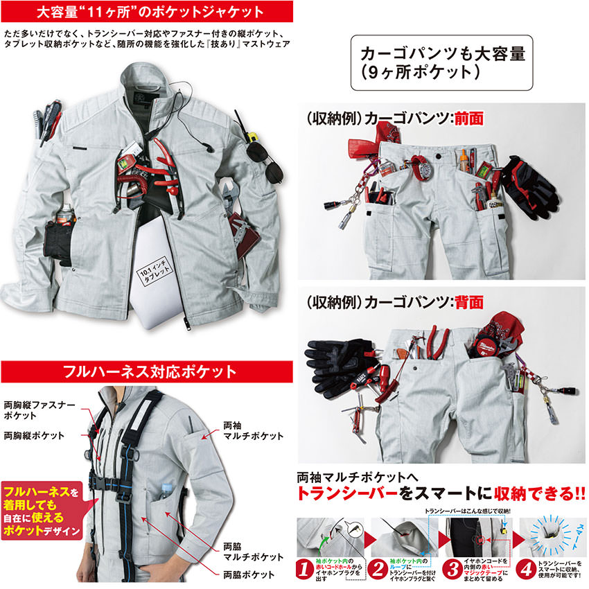 | ・伸縮性があり動きやすく作業効率があがる、生地が伸びる、しゃがむことが多い現場に最適です。 |
