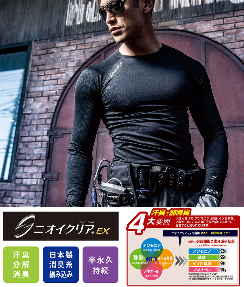 不快なニオイ成分を含む汗を繊維の力で瞬時に“水”に分解し無臭化。裏起毛素材でフワッとした肌ざわりと保温性を両立したパワーサポート