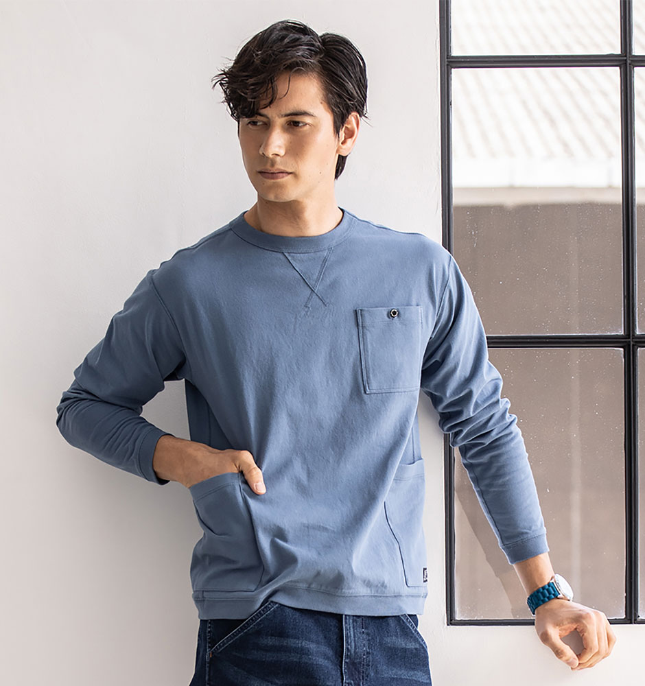 程よくゆったりとしたリラックスシルエットに収納力抜群の5ポケット付き。ざっくりしながら優しい着心地の長袖Tシャツ。