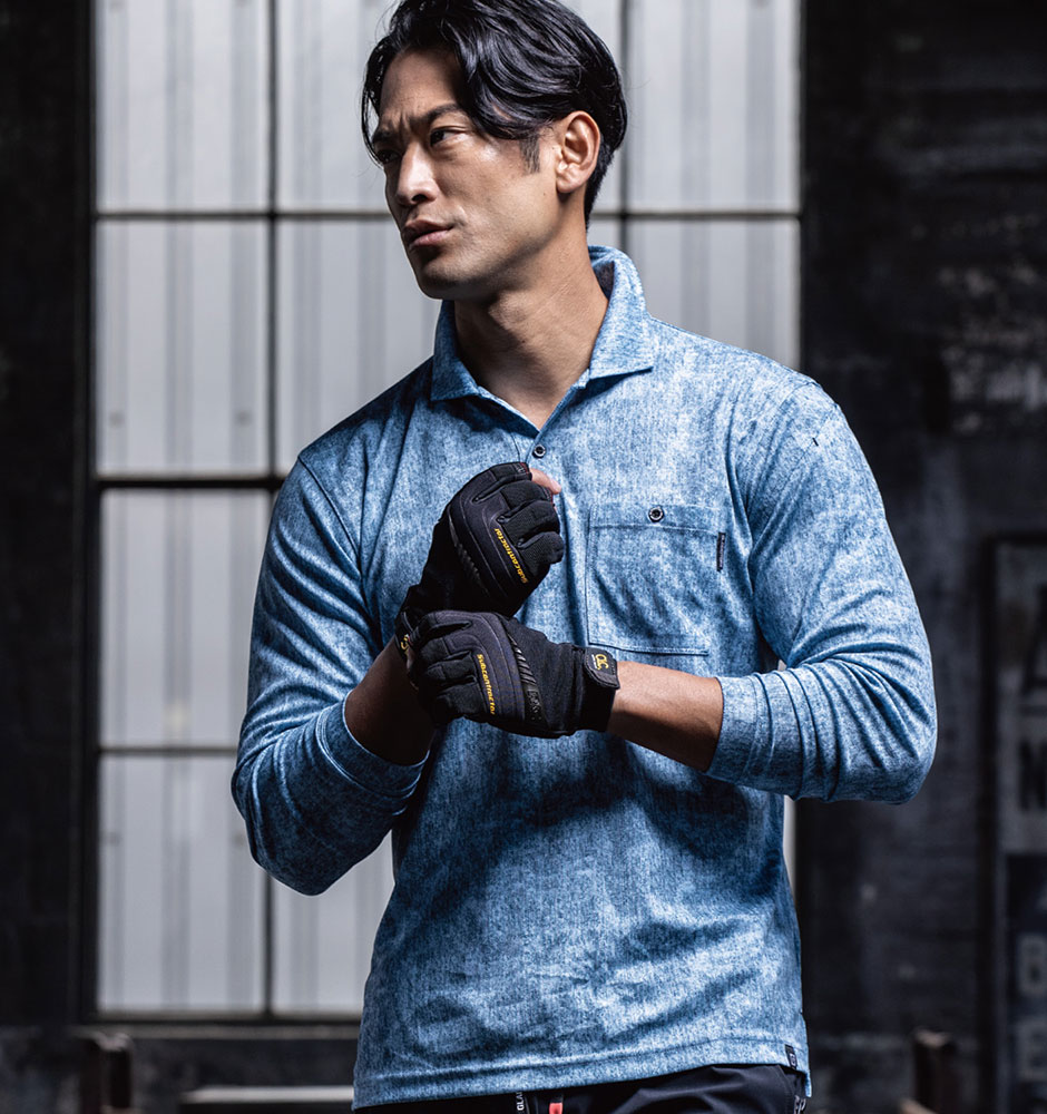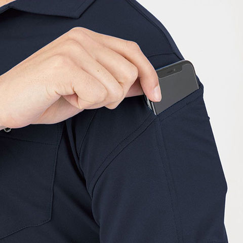 | 汗ジミ防止(汗取りパッド付き)、ボタン付胸ポケット、左袖マルチポケット、消臭テープ付 |