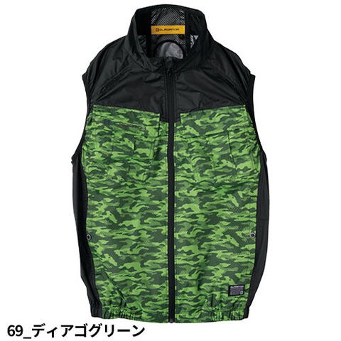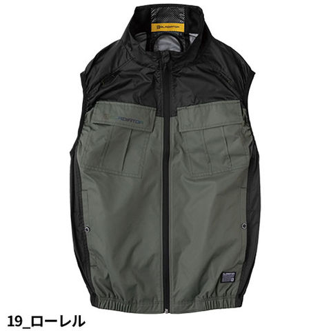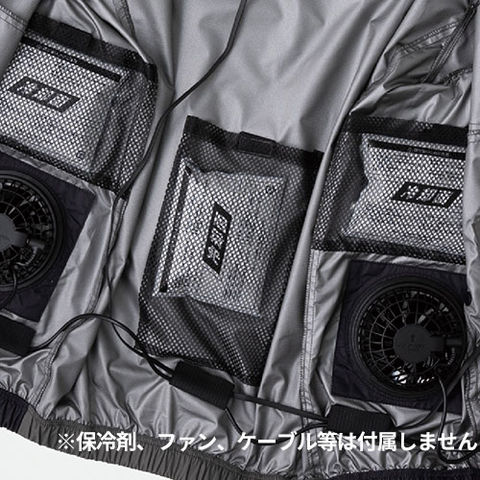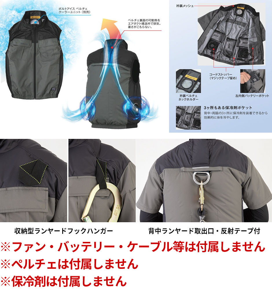 | 日傘遮熱、リップストップ素材、サイドファン、フルハーネス対応、ペルチェネックホルダー、保冷剤ポケット3ケ所、衿ワイヤー入り、オーロラロゴプリント、反射 |