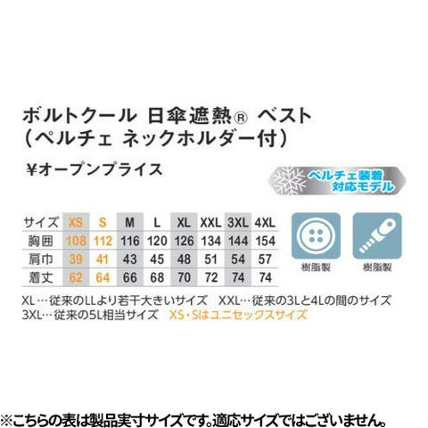 | ※ファン、バッテリー、ケーブルは別売りです。 ※ペルチェは別売りです。 ※XL・従来のLLより若干大きいサイズ、XXL・従来の3Lと4Lの間のサイズ、3XL・従来の5L相当サイズ、XS・Sはユニセックスサイズです。 ※製品により若干の色違いが発生することがあります。ご了承ください。 |