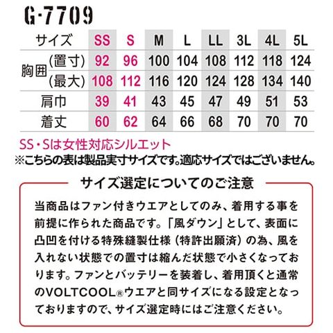| ※ファン、バッテリー、ケーブルは別売りです。 ※SS・Sはユニセックスサイズです。 【サイズ選定についてのご注意】 当商品はファン付きウェアとしてのみ着用することを前提に作られた商品です。「風ダウン」として表面に凹凸を付ける特殊縫製仕様のため風を入れない状態での置寸は縮んだ状態で小さくなっております。ファン・バッテリーを装着し着用いただくと通常のVOLTCOOLウェアと同サイズになる設定となっております。サイズ選定時にはご注意ください。 |