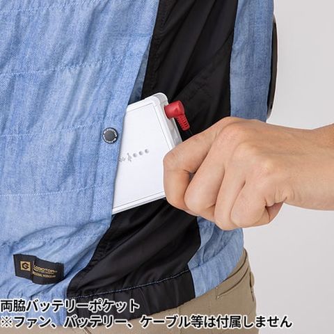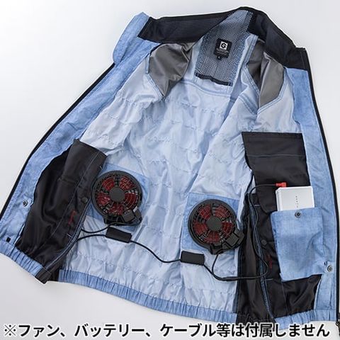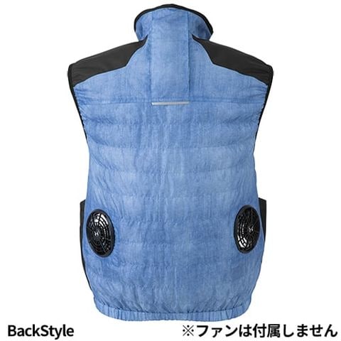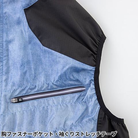 | 特殊縫製によりファンを稼働させると表面がダウンのように凸凹になる「風ダウン」 肩部にチタンコーティングを施し肩に直接あたる赤外線・紫外線をカット 衣服内の温度上昇を抑えます。 |