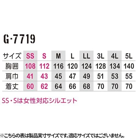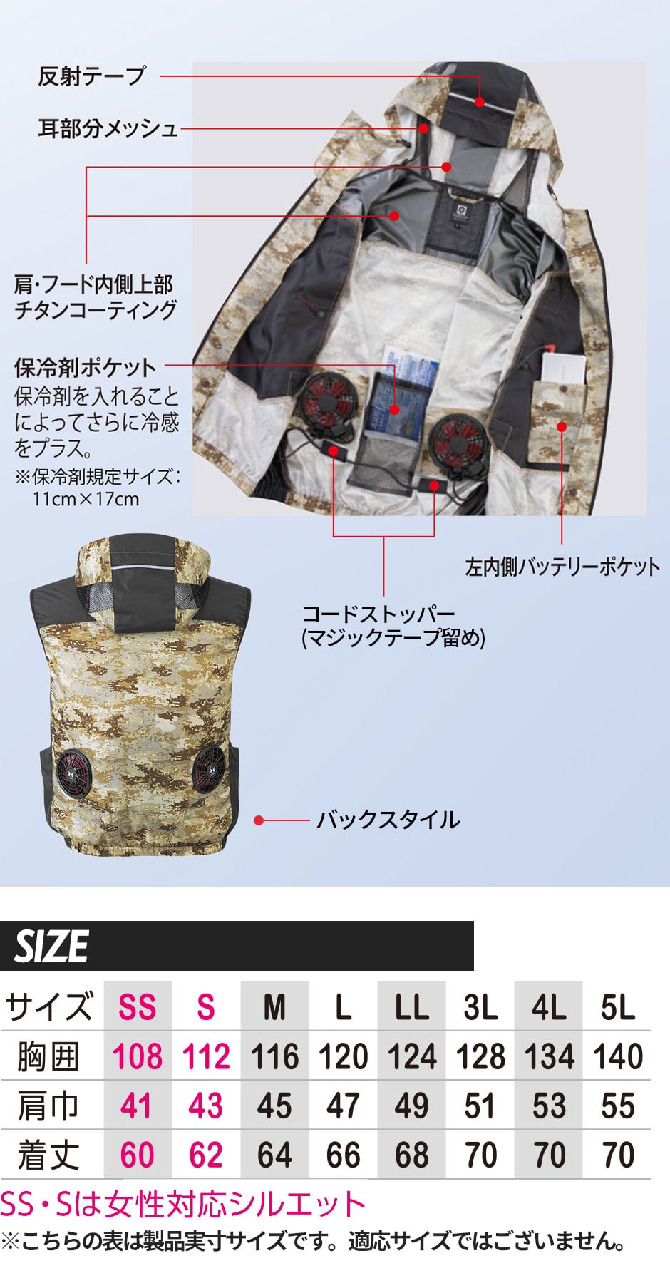 | ※ファン、バッテリー、ケーブルは別売りです。 ※SS・Sはユニセックスサイズです。 |