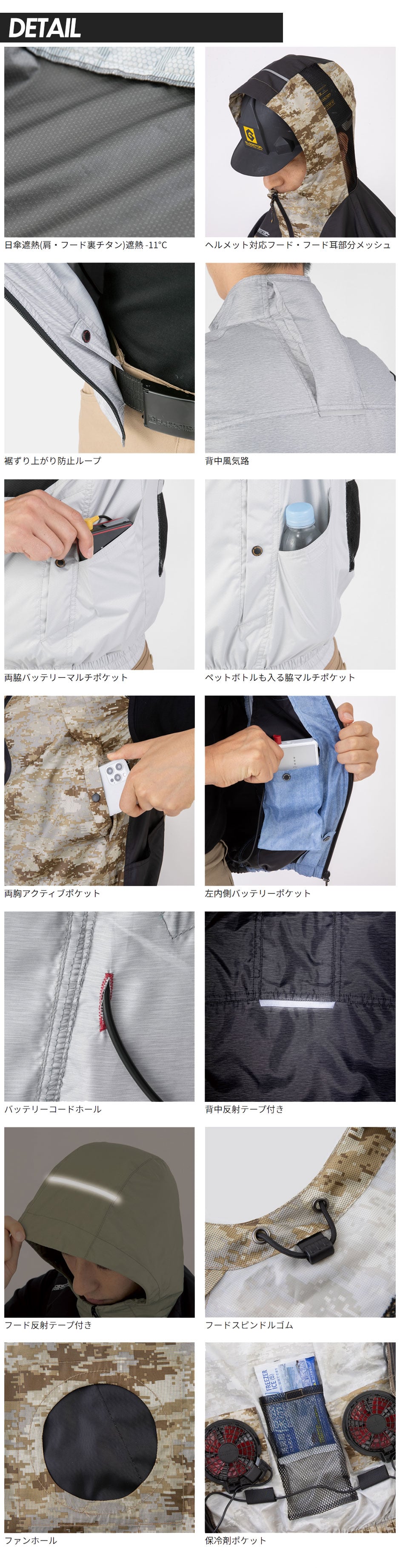 | 日傘遮熱仕様(肩部とフード上部)、遮熱マイナス11℃、ヘルメット対応フード、フード耳部分メッシュ、フードスピンドルゴム、反射テープ (フード、背中)、背中風気路、両胸アクティブボケット、両脇バッテリーマルチボケット、ずり上がり防止ループ |