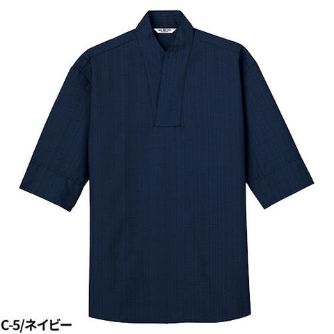 表情ある立体感が美しい素材を採用したシンプルな和風シャツ。店舗の雰囲気に合わせて選べる襟元デザインが3タイプ、5色展開です。袖口ネット付きで衛生面にもしっかり配慮しています。