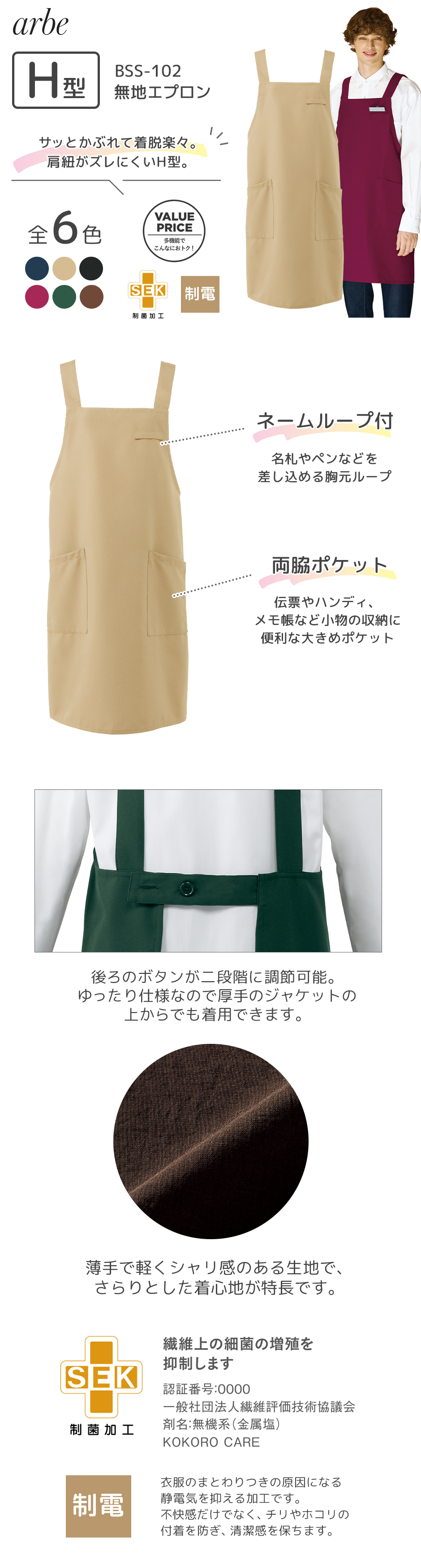 [ 特別価格 ][メール便対応] エプロン かぶる だけ H型 おしゃれ 胸当て チトセ アルベ arbe BSS-102 BSS102 ロング丈 後ろボタン シンプル カジュアル コスパ ポケット付き 飲食店 レストラン カフェ 家事 業務用 オシャレ かわいい 可愛い 定番 人気 かぶり 大