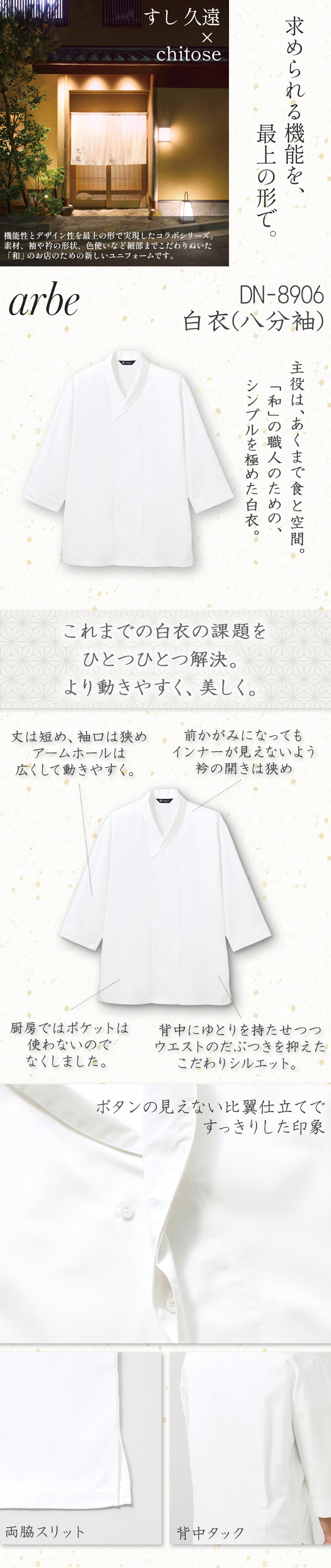 白衣 調理白衣 制服 ユニフォーム チトセ アルベ arbe 白衣(八分袖)[兼用] DN8906 飲食店 厨房服 調理服 寿司屋 和食店 割烹 料亭 居酒屋 おしゃれ かっこいい プロ仕様