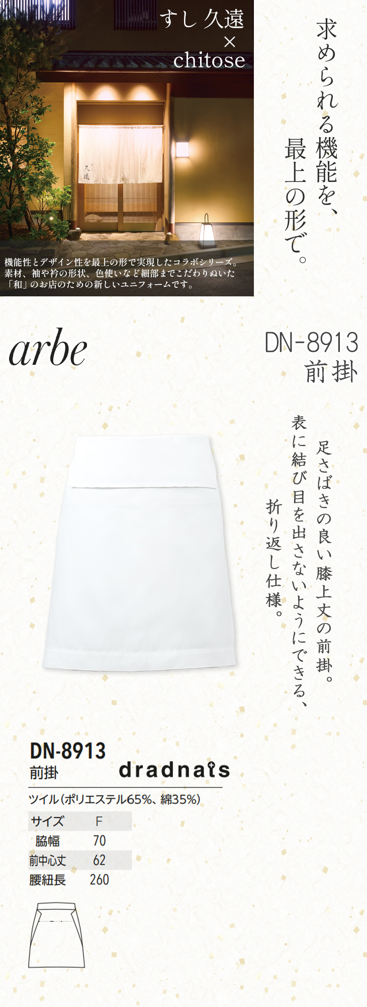 | 職人のこだわりを形にしたすし久遠×チトセコラボシリーズ。動きやすさと上品な美しさを兼ね備えたアイテムを取り揃えました。 足さばきの良い膝上丈の前掛。表に結び目を出さないようにできる、折り返し仕様。 |
