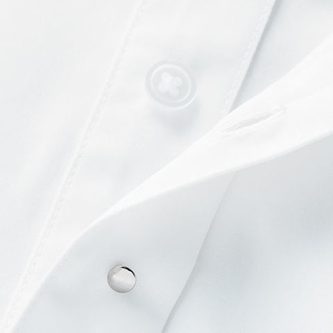 | 襟なし、フェイクボタン、比翼仕立て、両脇スリット、フロントにはメタルボタンをあしらいシックな印象に |