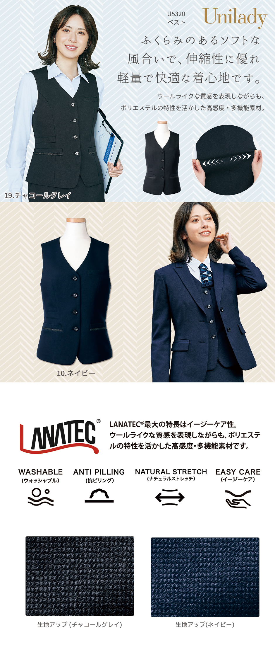 | イージーケア、ストレッチ、あらゆる職種で採用実績多数、スマホポケット付きで収納性◎、洗濯機対応 |