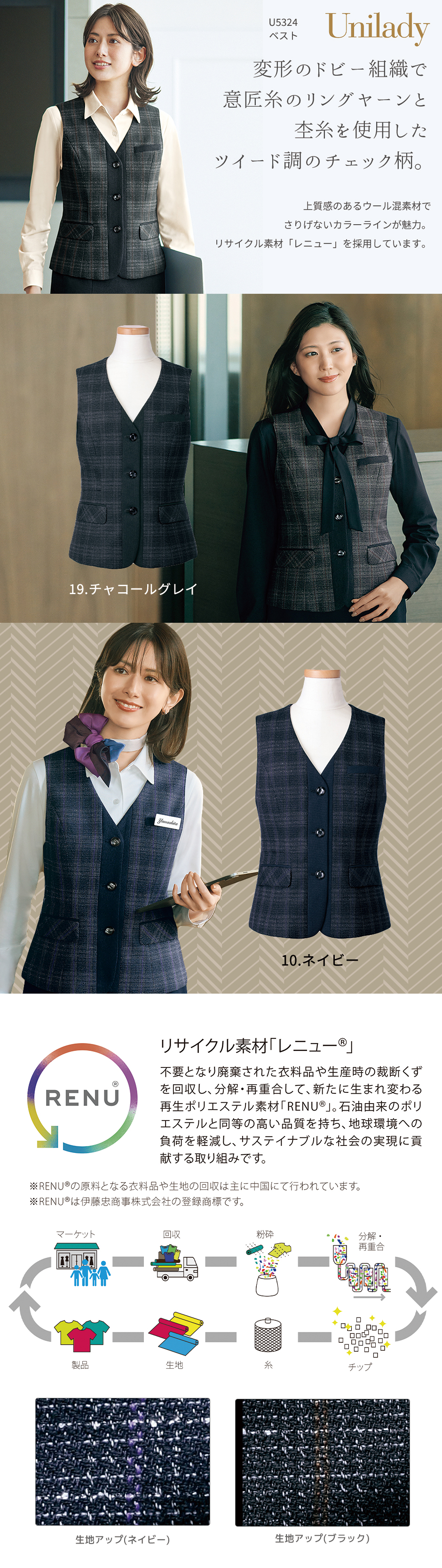 上質感のあるウール混素材で、さりげないカラーラインが魅力。リサイクル素材「レニュー」を採用しています。