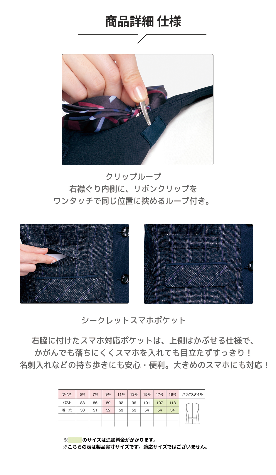 | ■フロントファスナー 表に見えないフロントファスナー仕様。すっきりとしたデザインで脱ぎ着もラク。 ■クリップループ 右襟ぐり内側に、リボンクリップをワンタッチで同じ位置に挟めるループ付き。肌当りも防ぎます。 ■シークレットスマホポケット(実用新案登録第3211918号) 大きめのスマホにも対応!右脇に付けたスマホ対応ポケットは、上側はかぶせる仕様で、かがんでも落ちにくく、スマホを入れても目立たずすっきり!名刺入れなどの持ち歩きにも安心で便利。 |