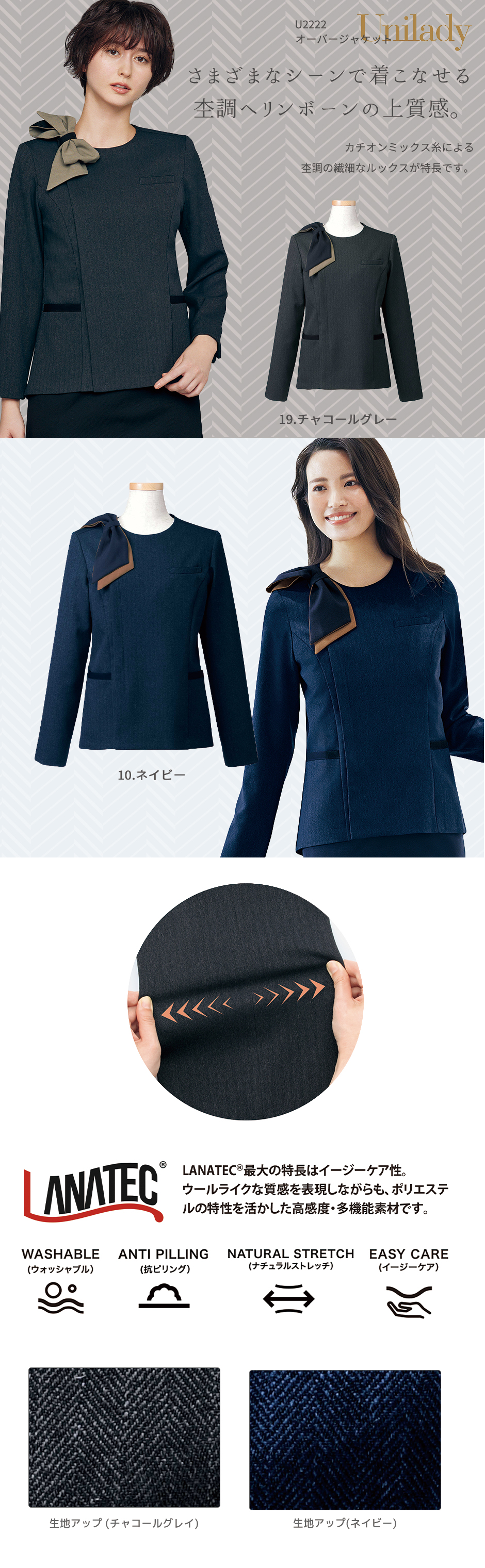 | イージーケア、ストレッチ、あらゆる職種で採用実績多数、フロントファスナーで着脱がラク、洗濯機対応、肩パットなし |