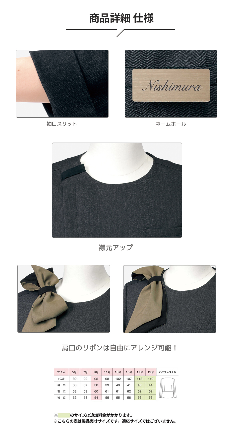 | ■ネームホール 胸ポケットの外側中央に、ペンを挿しても邪魔にならないネームホールを付けました。 ■リボンは取り外して着用できます。 ■袖口スリット 袖丈の調節や着こなしのアレンジに。 ■ストレッチ ソフトでほどよいストレッチ性があり、動きやすく体にフィット。 |