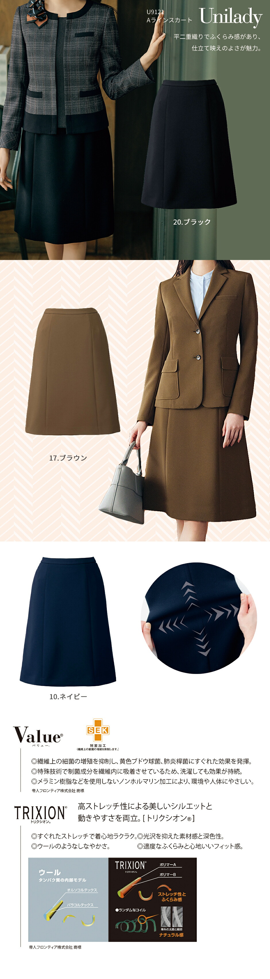 平二重織りでふくらみ感があり、仕立て映えのよさが魅力。制菌加工バリューをほどこし、伸縮性抜群のトリクシオンを使用した2WAYストレッチ素材で、快適・安心・清潔な着心地です。