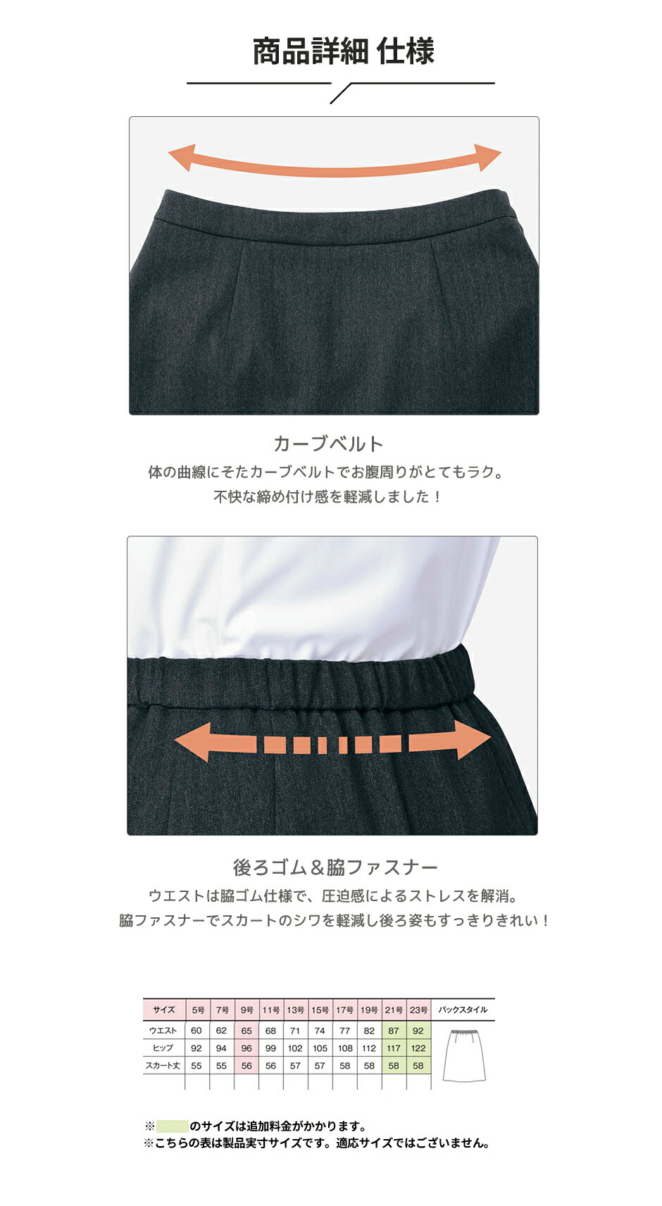 | ■カーブベルト 体の曲線に沿ったカーブベルトで、お腹まわりがとてもラク。不快な締め付け感を軽減しました! ■後ろゴム&脇ファスナー ウエストは後ろゴム仕様で、圧迫感によるストレスを解消。脇ファスナーでスカートのシワを軽減し後ろ姿もすっきりきれい! |