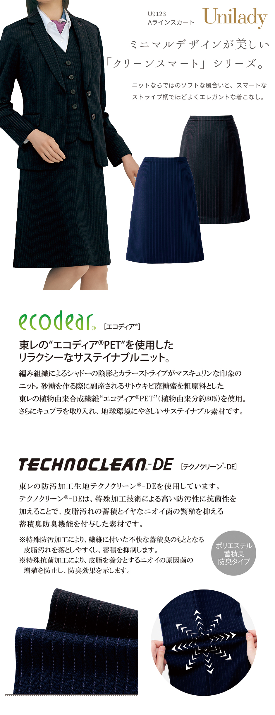 | デオストライプニット(表地/ポリエステル95% キュプラ5%) [エコディア?]東レの“エコディアPET”を使用したリラクシーなサステイナブルニット。編み組織によるシャドーの陰影とカラーストライプがマスキュリンな印象のニット。砂糖を作る際に副産されるサトウキビ廃糖蜜を粗原料とした東レの植物由来合成繊維“エコディアPET”(植物由来分約30%)を使用。さらにキュプラを取り入れ、地球環境にやさしいサステイナブル素材です。 [テクノクリーン?-DE]東レの防汚加工生地テクノクリーン-DEを使用しています。テクノクリーン-DEは、特殊加工技術による高い防汚性に抗菌性を加えることで、皮脂汚れの蓄積とイヤなニオイ菌の繁殖を抑える蓄積臭防臭機能を付与した素材です。 ポリエステル蓄積臭防臭タイプ ※特殊防汚加工により、繊維に付いた不快な蓄積臭のもととなる 皮脂汚れを落としやすくし、蓄積を抑制します。 ※特殊抗菌加工により、皮脂を養分とするニオイの原因菌の 増殖を防止し、防臭効果を示します。 |