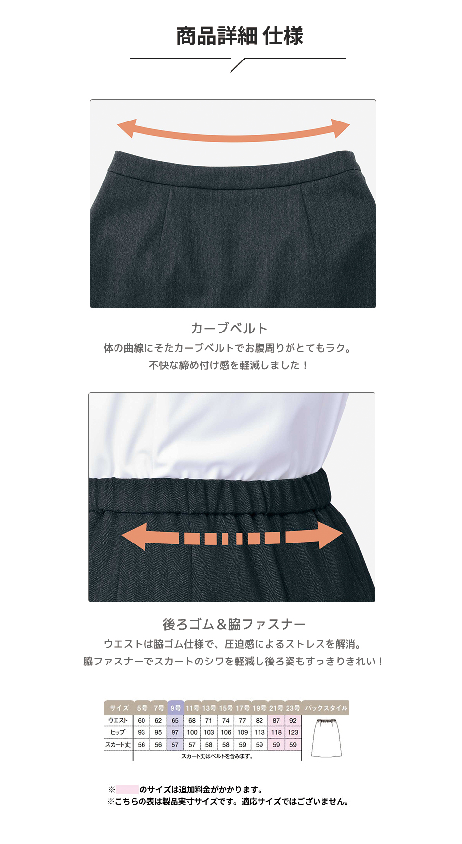 | ■ニットストレッチ 軽い着心地で動きやすい、ソフトな風合いのニット素材。 ■カーブベルト 体の曲線にそったカーブベルトで、おなか回りがとても楽。不快な締め付け感を軽減しました。 ■後ろゴム&脇ファスナー ウエストは後ろゴム仕様で、圧迫感によるストレスを解消。脇ファスナーでスカートのシワを軽減し後ろ姿もすっきりきれい! |