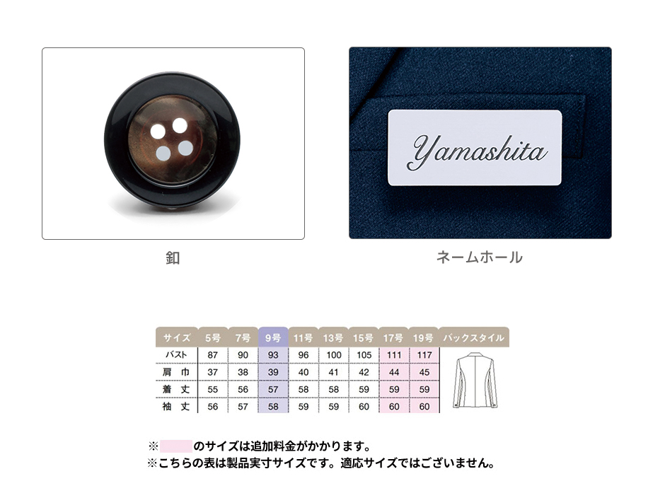 | ■W機能肩パッド ■2WAYストレッチ タテ・ヨコともに伸縮する2WAYストレッチだから動きやすく、フィット感も抜群です。 ■スマホ内ポケット 袋布の形状を工夫して、スマホの出し入れがとてもスムーズ。しかも落ちにくい安心設計。見返し端には、レッドのパイピングをあしらって、おしゃれに。 ■クリップループ 右襟下に、ワンタッチでリボンクリップを挟めるループ付き。 ■ネームホール 胸ポケットの外側中央に、ペンを差しても邪魔にならないネームホールを付けました。 ■サイドベンツ 腰まわりにゆとりがあり、座り姿勢もラクなサイドベンツ仕様。 |