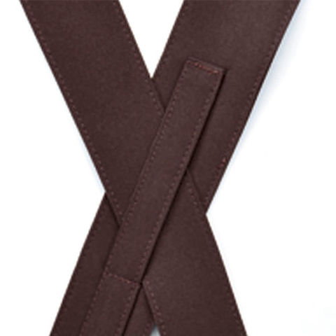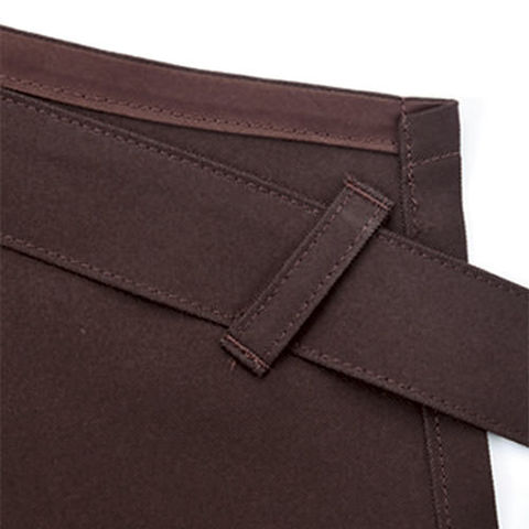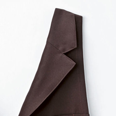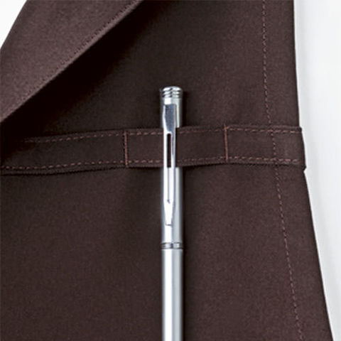 | 紐のクロス部分にズレ防止のためのループ付き。ループを斜めにすることで紐を綺麗に通すことができます。胸当てにスタイリッシュな襟がついていてさりげなくオシャレ。胸元にペン挿しループが付いているのでとても便利。広めのマチ付きポケットは伝票などを収納するのに便利。 |