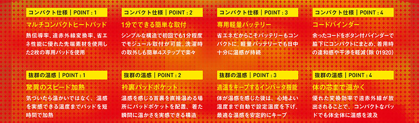 省エネだからこそバッテリーもコンパクト。軽量バッテリーでも日中十分に温感が持続