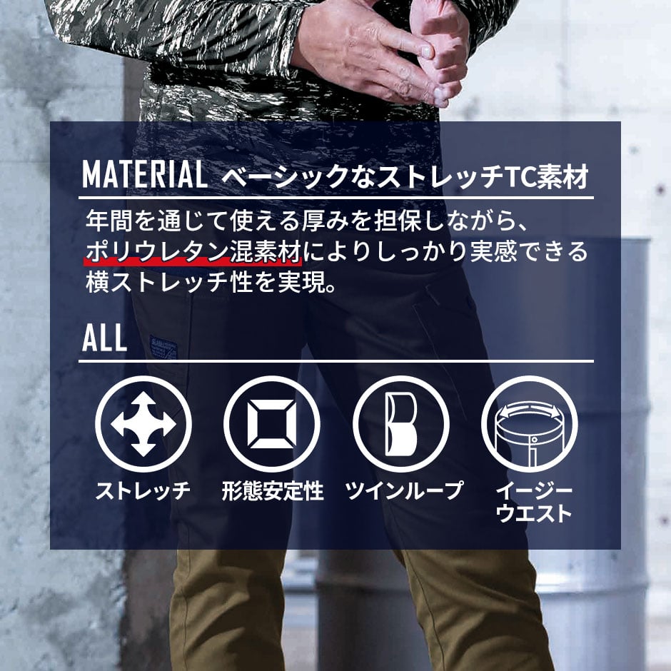 | ベーシックなストレッチTC素材 年間を通じて厚みを担保しながら、しっかり実感できるヨコストレッチ性を実現 |