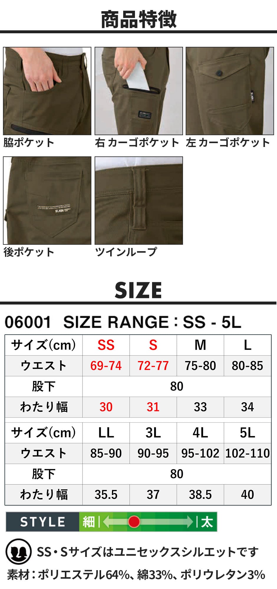 | 脇ポケット、右カーゴポケット、左カーゴポケット、後ポケット、ツインループ |