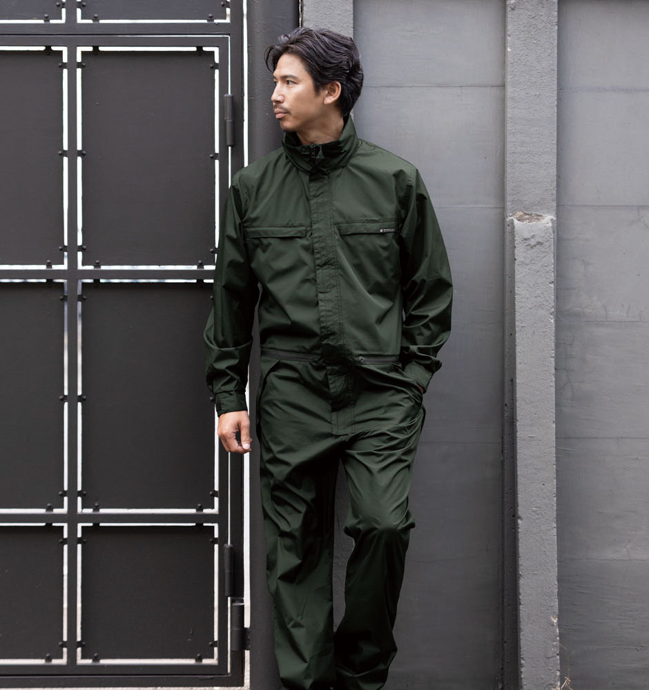 | はっ水加工、フードドローコード、右胸ファスナー付ポケット、左胸ファスナー付ポケット、ウエストアジャスター(両開き止水ファスナー)、両脇ポケット、右後ファスナー付ヒップポケット、袖口ファスナー付アジャスター |