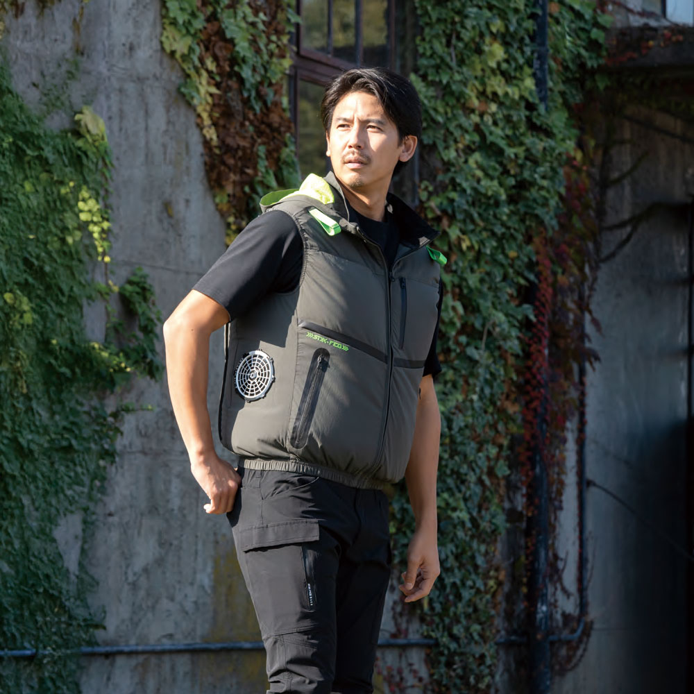 | ベスト(袖無し)、サイドファン、着脱可能フード+ワイドネック一体化、背中アイスポケット、両脇アイスポケット、衿裏アイスポケット(3カ所保冷剤ポケット)、フルハーネス対応 |