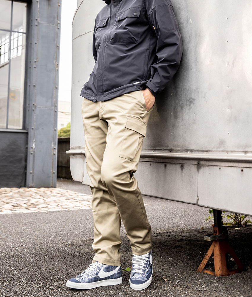 | ウエストストレッチ、ウォッチポット付き、マルチポケット、ミリタリー仕様のカーゴポケット、カラビナループとして使えるアメリカンネーム |