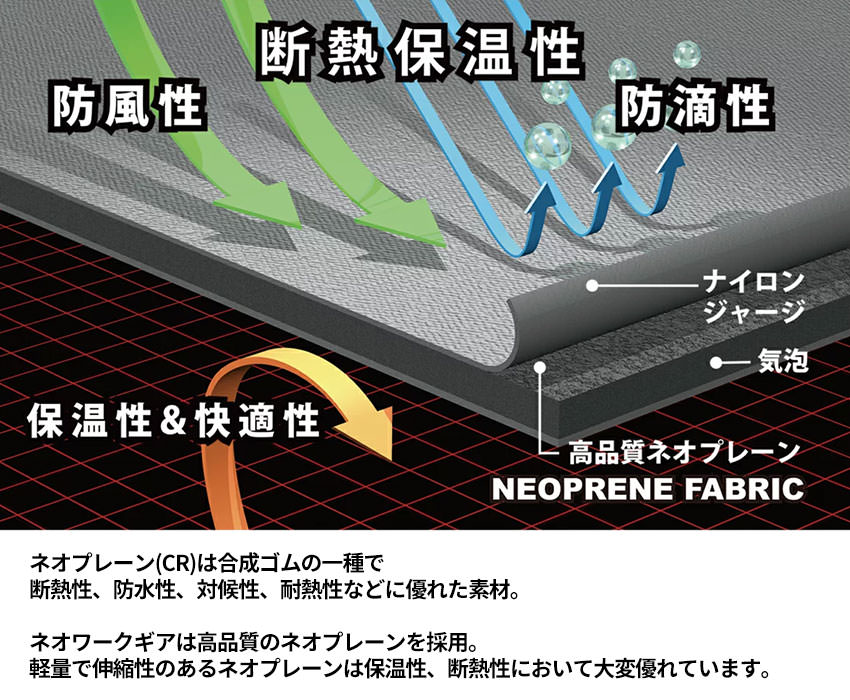 軽量で伸縮性のある高品質ネオプレーンは保温性、断熱性において大変優れています。