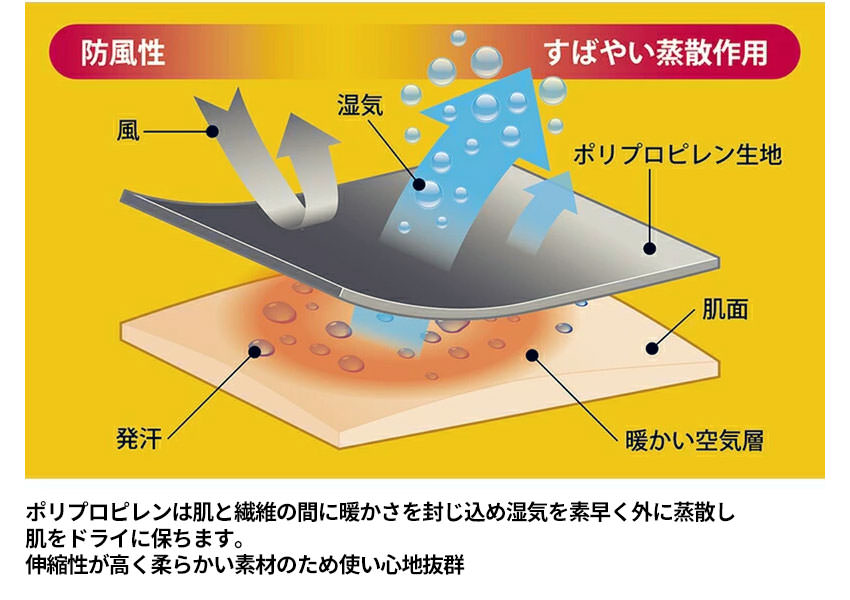■ポリプロピレンは肌と繊維の間に暖かさを封じ込め湿気を素早く外に蒸散し肌をドライに保ちます。伸縮性が高く柔らかい素材のため使い心地が抜群です。