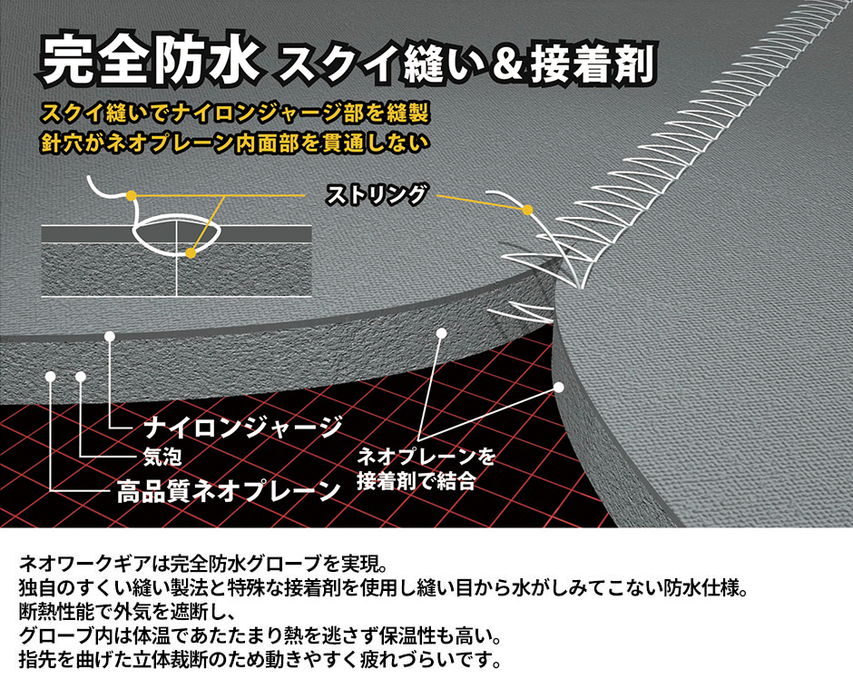 生地と生地の接合部には特殊な接着剤と高度なすくい縫いを施しております。そのため、縫い目などから水が漏れにくいので、日々の作業のお供に最適です。