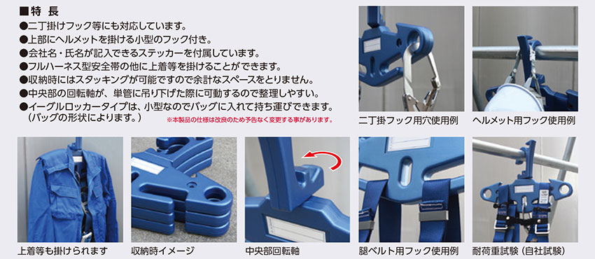 | ●二丁掛けフック等にも対応 ●上部にヘルメットを掛ける小型のフック付き ●会社名・社名を記入できるステッカー付属 ●フルハーネス型安全帯の他に上着等を掛けることができます。 ●収納時にスタッキング可能 ●中央部の回転軸が単管に吊り下げた際に可動するので整理しやすい。 |