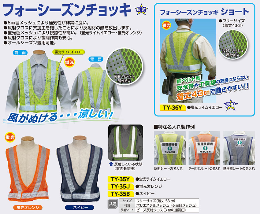 | ●6mmメッシュにより通気性が非常に良い ●反射クロスに穴加工を施したことにより反射材の熱を放出します。 ●蛍光色メッシュにより視認性が高い ●反射クロスにより夜間作業も安心 ●オールシーズン着用可能 |