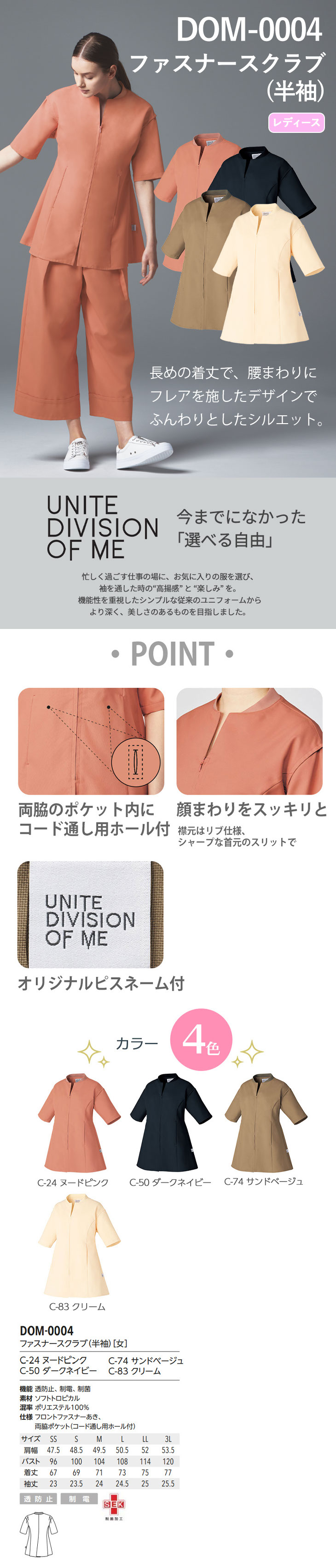 ファスナースクラブ 半袖 白衣 DOM-0004 レディース 女性用 unite ユナイト チトセ 医師 医者 看護師 ナース ナース服 研修医 医療 人気 手術衣 ジップスクラブ 長め 制服 ユニフォーム 病院 小児科 エステ 介護 可愛い かわいい おしゃれ