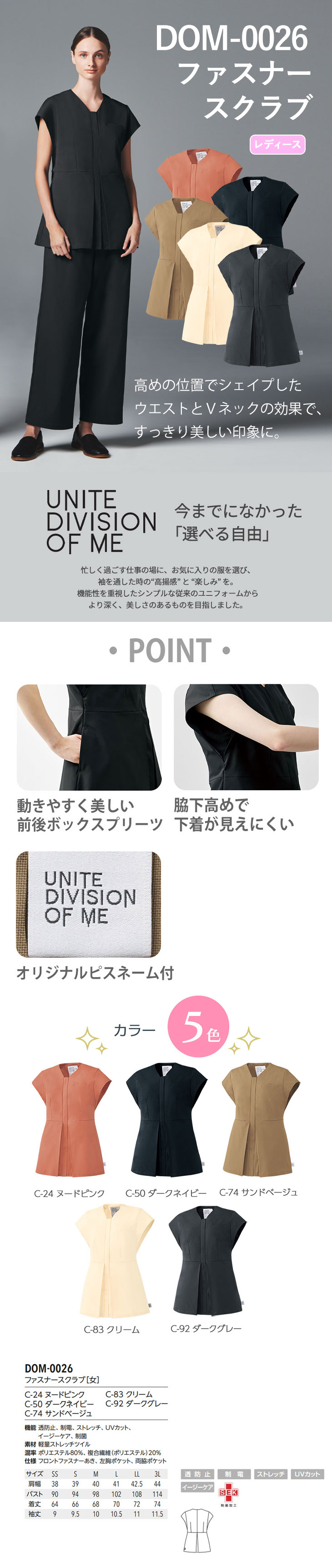 ファスナースクラブ 白衣 DOM-0026 ノースリーブ 袖なし レディース 女性用 unite ユナイト チトセ 医者 看護師 ナース ナース服 研修医 医療 人気 手術衣 ジップスクラブ Vネック 制服 ユニフォーム 病院 介護 可愛い かわいい おしゃれ 動きやすい