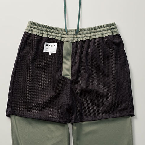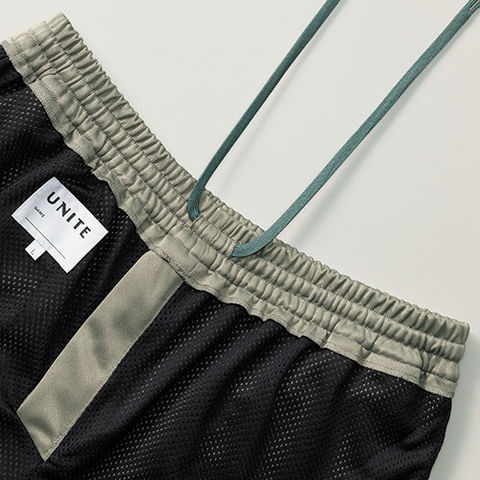 前ファスナー付、ウエストゴム・ヒモ入り、メッシュ裏地付、両脇ポケット、左右ヒップポケット