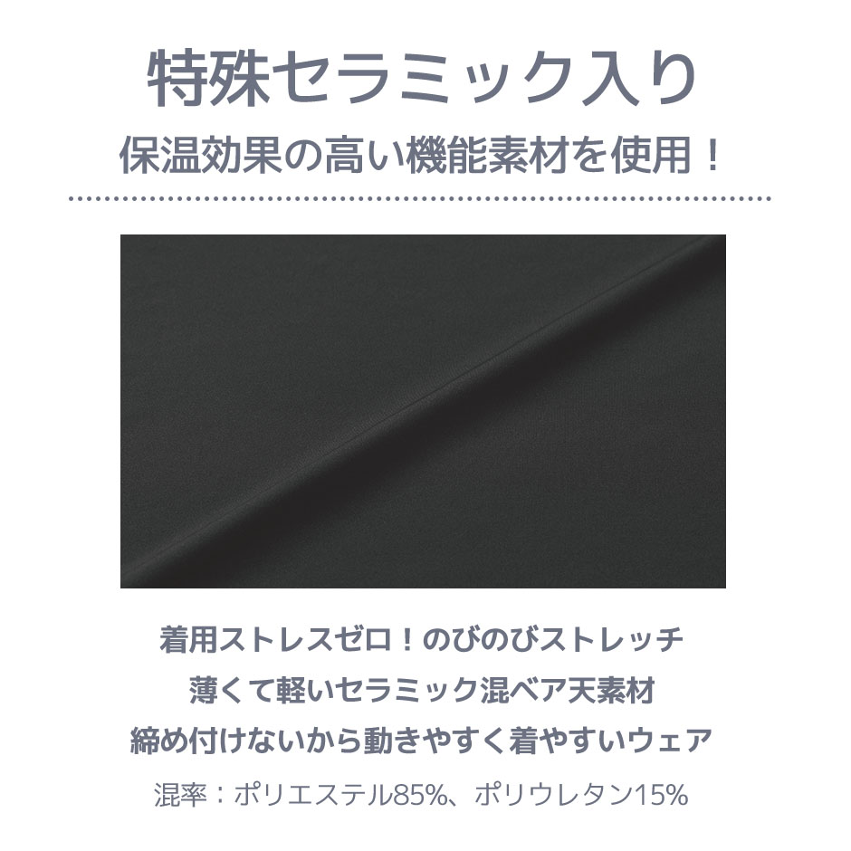 | セラミック混ベア天(ポリエステル85%、ポリウレタン15%)特殊セラミックの粉末が練り込まれた機能素材を使用。人の身体から放射される遠赤外線を吸収し輻射することで温もりを保ち保温効果を与えます。軽くて薄く、伸縮性の高い生地に編み上げました。 |