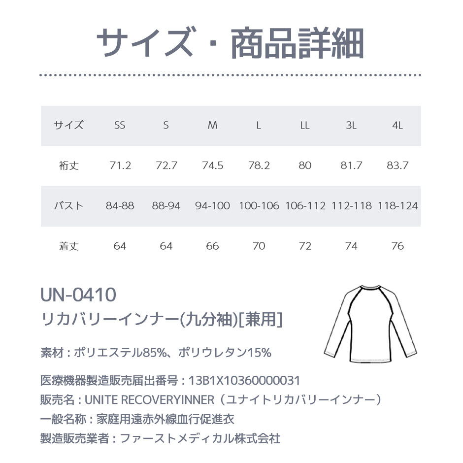 | 医療機器製造販売届出番号:13B1X10360000031 販売名:UNITE RECOVERYINNER(ユナイトリカバリーインナー) 一般名称:家庭用遠赤外線血行促進衣 製造販売業者:ファーストメディカル株式会社 |