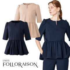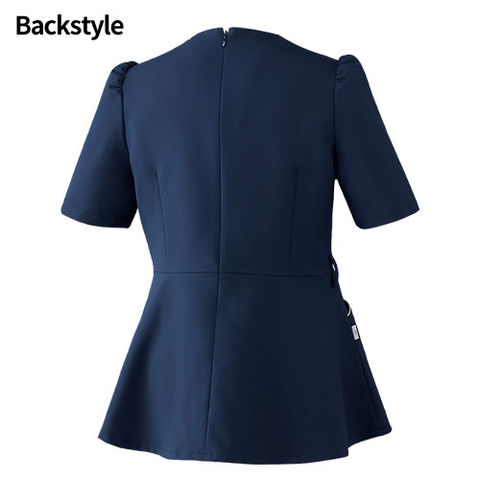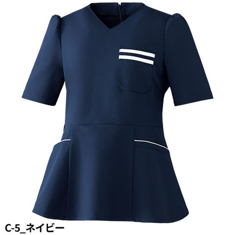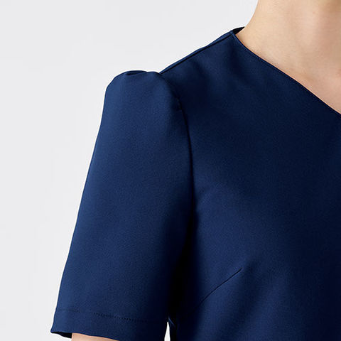 | ウエストシェイプでスッキリ見えが叶うスクラブ。胸元の2本のラインで洗練された印象に。 |