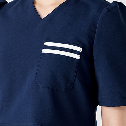 ウエストシェイプでスッキリ見えが叶うスクラブ。胸元の2本のラインで洗練された印象に。