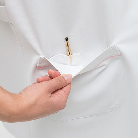 光の透過性を抑えた高ランダム扁平断面糸(アレニエ)を使用することにより、高い防透性を実現しました。適度な伸縮性が動きやすさをもたらせています。特殊仕上により吸水、防汚効果を付加しています。業務用洗濯にも耐えうる形態安定素材です。