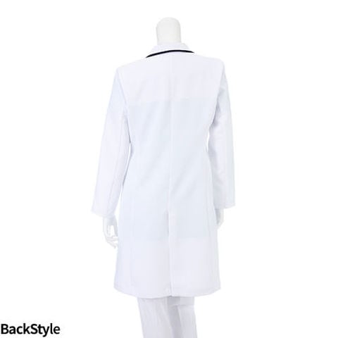 マニッシュな印象のピークドラペルと衿のネイビー配色が、凛とした佇まいの女性用診察衣。ほど良くシェイプされたウエストから、ゆとりのある裾へのシルエットが女性らしさを感じさせます。