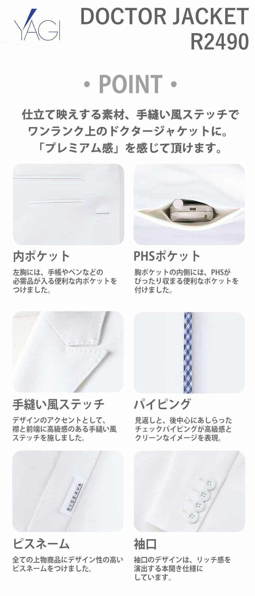 ドクターコート ジャケット 長袖 R2490 リゼルヴァ RISERVA 白衣 メンズ 男性用 医者 病院 看護師 ナース 医療用 制服 ユニフォーム 高級 パイピング 名入れ おしゃれ かっこいい 動きやすい おすすめ