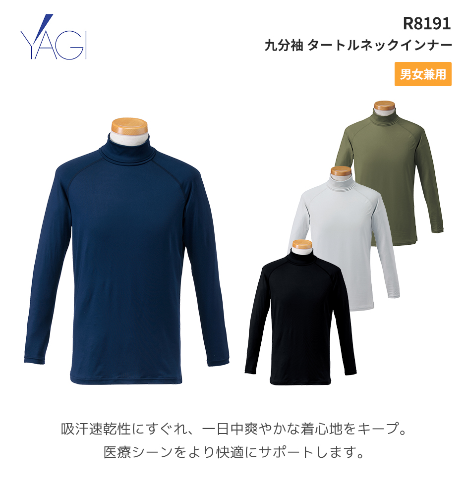 リゼルヴァのインナーが、医療シーンをより快適にサポートします。吸汗速乾性にすぐれ、一日中爽やかな着心地をキープ。肩まわりがラクなラグランスリーブでVネックとタートルネックの2タイプをご用意。