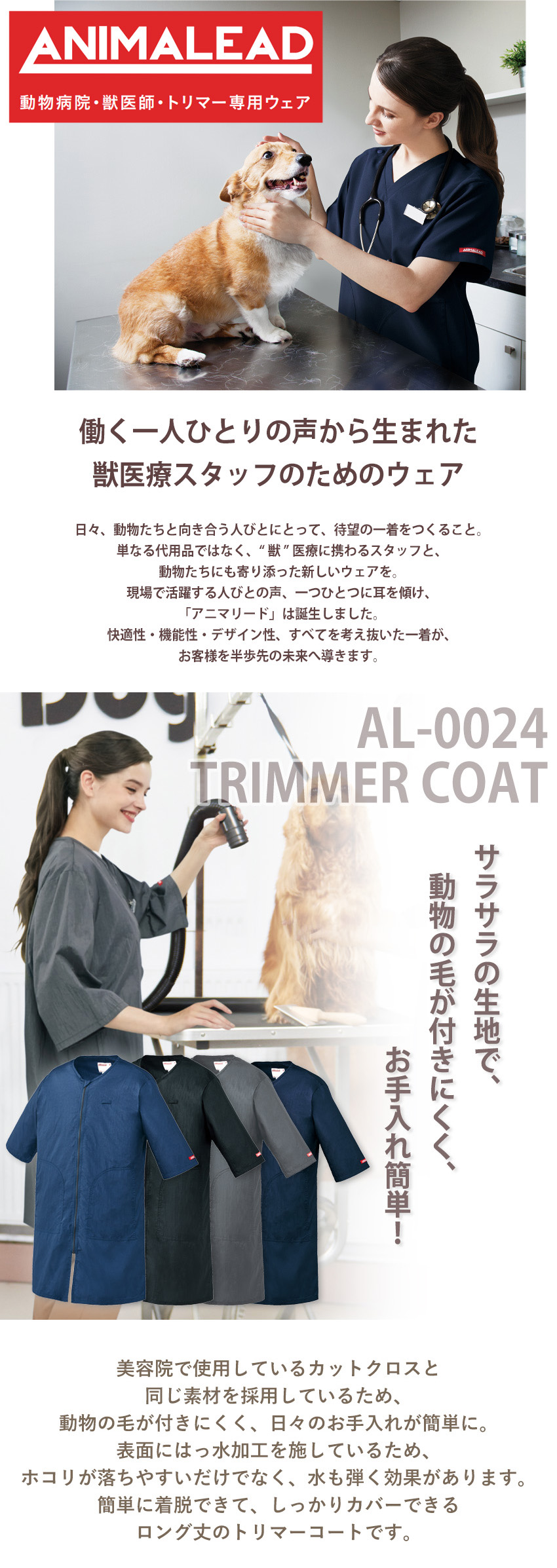 トリマー ケアウェア 袖ありエプロン animalead チトセ トリマーコート[兼用] AL-0024 ペットショップ ペットサロン 動物病院